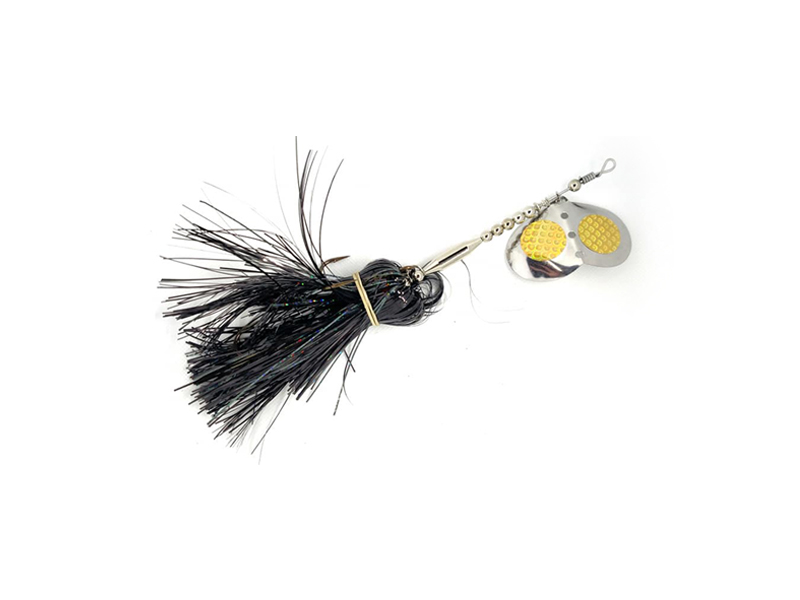 Musky marks Jitter Spinner. Whether it’s the small Marabou Jitter Spinner or the larger flashabou version, they both get pike and Muskies coming to the dinner table. These also come through the water easy so they’re not hard to reel